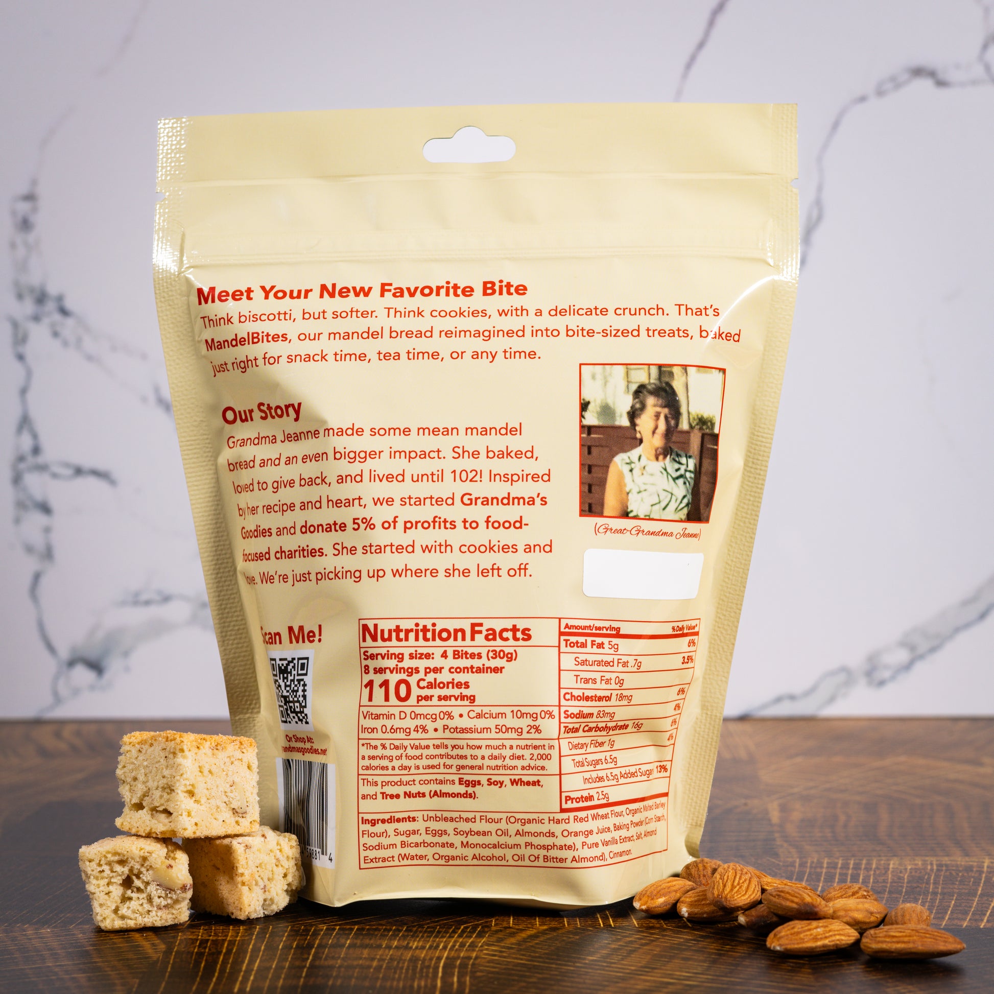 Grandma Jeanne was known for her signature Almond Mandel Bread. All we did was follow her classic recipe and package it for you to enjoy. These MandelBites are delicately crisp with just the right touch of sweetness. Perfect with coffee or tea, or as an elegant addition to your dessert table.