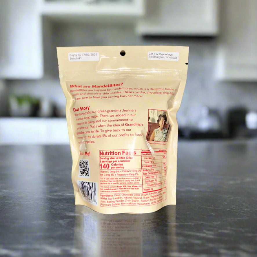 Introducing MandelBites – the beloved taste of mandel bread, now in a perfectly poppable size. Based on Great-Grandma Jeanne’s cherished recipe, these chocolate chip delights are crispy, sweet, and irresistibly snackable. Each bite captures the classic charm of mandel bread with the rich goodness of chocolate chips. Enjoy them with your favorite coffee, tea, or straight from the bag. Handmade with love, MandelBites are a little taste of tradition in every crunch – and with 5% of profits going to food charities, every bite does a little good too.